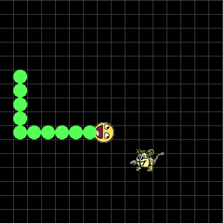 Programm: # SnakeGame.py from gamegrid import * # ---------------- class Snake ---------------- class Snake(Actor): def __init__(self): Actor.__init__(self, True, "sprites/snakehead.gif") self.tail = [] def reset(self): for i in range(2): segment = TailSegment() addActor(segment, Location(snake.getX(), snake.getY() + i + 1)) self.tail.append(segment) def tryToEat(self, lastLocation): actor = getOneActorAt(self.getLocation(), Food) if actor != None: newSegment = TailSegment() addActor(newSegment, lastLocation) self.tail.append(newSegment) actor.removeSelf() addActor(Food(), getRandomEmptyLocation()) def act(self): lastIndex = len(self.tail) - 1 if lastIndex > -1: lastLocation = self.tail[lastIndex].getLocation() for i in range (lastIndex, 0, -1): self.tail[i].setLocation(self.tail[i-1].getLocation()) self.tail[0].setLocation(self.getLocation()) self.move() a = getOneActorAt(self.getLocation(), TailSegment) if not self.isInGrid() or a != None: removeAllActors() addActor(Actor("sprites/gameover.gif"), Location(9, 9)) return self.tryToEat(lastLocation) # ---------------- class Tailsegment---------------- class TailSegment(Actor): def __init__(self): Actor.__init__(self, "sprites/snaketail.gif") # ---------------- class Food ---------------- class Food(Actor): def __init__(self): Actor.__init__(self, "sprites/mouse.gif") def keyCallback(keyCode): if keyCode == 38: # UP snake.setDirection(270) if keyCode == 40: # DOWN snake.setDirection(90) if keyCode == 39: # RIGHT snake.setDirection(0) if keyCode == 37: # LEFT snake.setDirection(180) makeGameGrid(20, 20, 20, Color.gray, False, keyRepeated = keyCallback) snake = Snake() addActor(snake, Location(10,10)) snake.setDirection(Location.NORTH) food = Food() addActor(Food(), getRandomEmptyLocation()) show() setSimulationPeriod(400) doRun() |