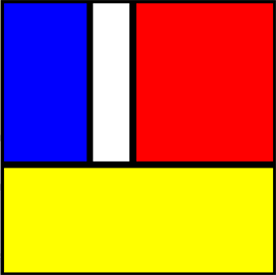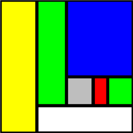 Programm: # Mondrian.py from gpanel import * from random import * def between(a, b): return a + (0.2 + 0.3 * random()) * (b - a) def randomColor(): while True: result = choice(colors) return result def rect(xMin, yMin, xMax, yMax): for aColor in ('black', randomColor()): setColor(aColor) fillRectangle(xMin, yMin, xMax, yMax) xMin += delta yMin += delta xMax -= delta yMax -= delta def maybe(bias = None): return choice([False,True,bias,bias] if bias!=None else [False,True]) def draw(xMin = 0, yMin = 0, xMax = 500, yMax = 500): if xMax - xMin > threshold and yMax - yMin > threshold: if maybe(xMax - xMin > yMax - yMin): xMid = between(xMin, xMax) if maybe(): draw(xMin, yMin, xMid, yMax) rect(xMid, yMin, xMax, yMax) else: rect(xMin, yMin, xMid, yMax) draw(xMid, yMin, xMax, yMax) else: yMid = between(yMin, yMax) if maybe(): draw(xMin, yMin, xMax, yMid) rect(xMin, yMid, xMax, yMax) else: rect(xMin, yMin, xMax, yMid) draw(xMin, yMid, xMax, yMax) else: rect(xMin, yMin, xMax, yMax) makeGPanel(0, 500, 0, 500) colors = ['gray', 'lime', 'red', 'white', 'blue', 'yellow'] delta = 6 threshold = 100 setColor ('black') draw()